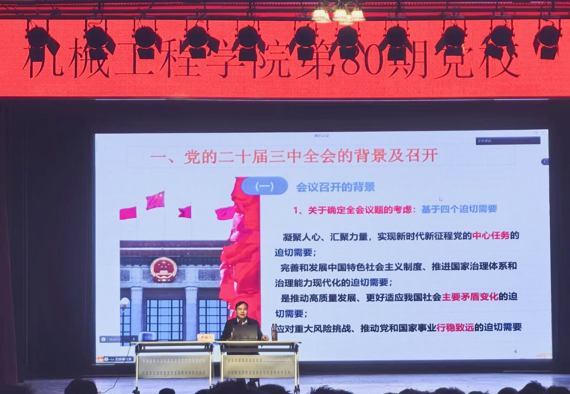 机械工程学院第80期党校培训于2024年11月2日在学校大礼堂顺利进行。本次党校主题围绕党员的成长与责任,深入贯彻党的二十届三中全会精神,进一步全面深化改革推进中国式现代化主题展开。培训邀请了马克思主义学院严雄飞教授、机械工程学院党委书记王雷、辅导员蔡昌为学院学生党员、预备党员、入党积极分子授课。