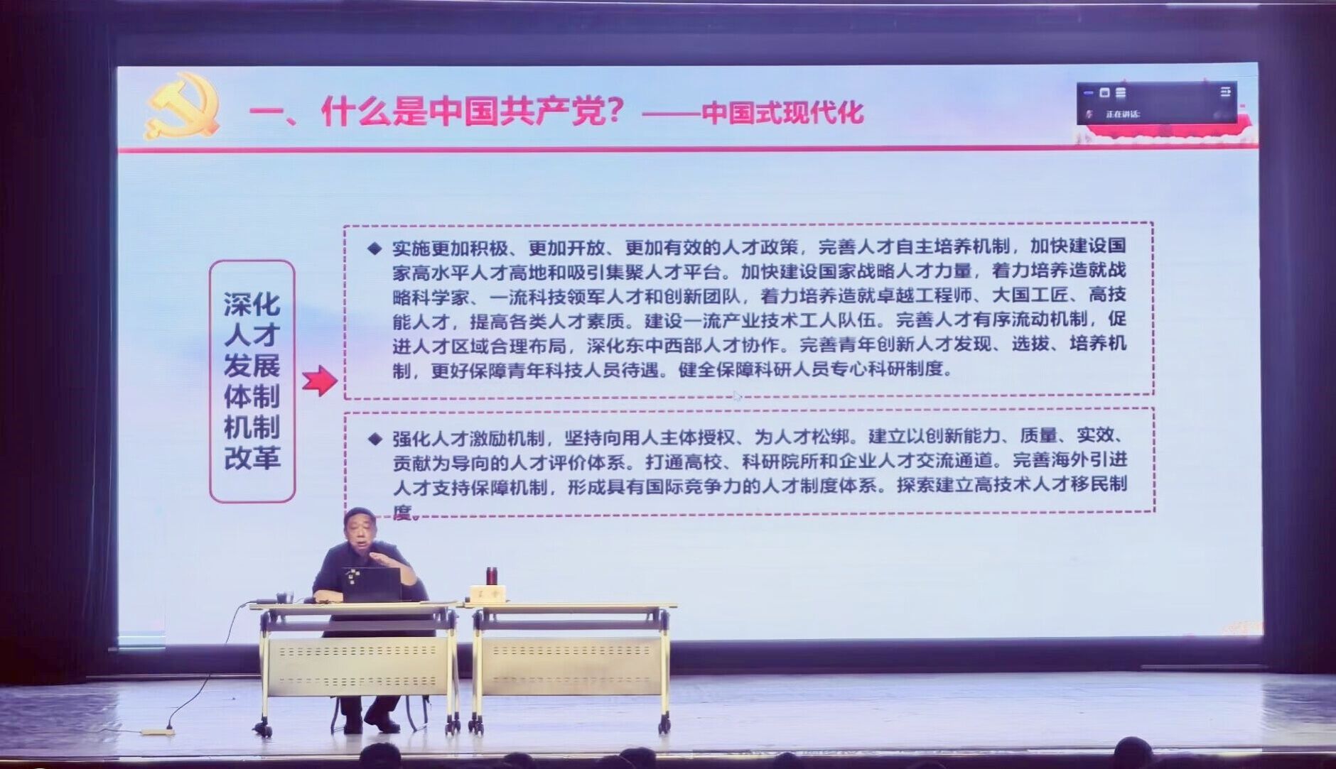 严雄飞以党的二十届三中全会为背景阐述了其召开的重要意义强调了进一步全面深化改革的必要性重要性及重要原则回顾了二十届三中全会的主题主要议程以及会后中央政治局工作的总结,帮助学生们理解国在经济科技创新和大国外交等方面取得的重大突破。同时,通过解析《报告》内在逻辑加以说明向学生们详细讲解了决定的六项基本原则七个聚焦的总目标。最后,他强调党的领导是进一步全面深化改革,推进中国式现代化的根本保证,号召全体党员以钉钉子精神抓好改革落实,为中华民族伟大复兴而努力奋斗。
