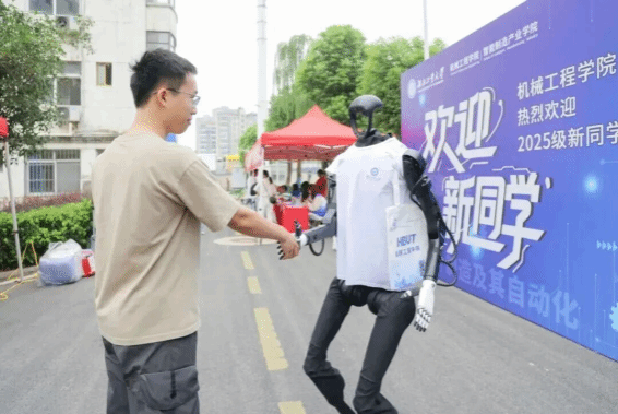 22日早上7时许,一位特殊迎新“工作人员”抵达东区报到点,与学工办全体辅导员、党员志愿者、助班,同步开启了上班状态,这位“沉默却热情”的人形机器人成了全场焦点,用机械的灵动与温度,点亮新生的大学初体验。它们虽不能开口说话,却会迈着灵活的步伐穿梭在人群中,主动靠近新生和家长“打招呼”;更能轻轻伸出机械臂,完成友好的握手动作。不少新生好奇地伸手回应,家长们也忙着用镜头定格这温馨又新奇的互动瞬间,现场笑声不断。