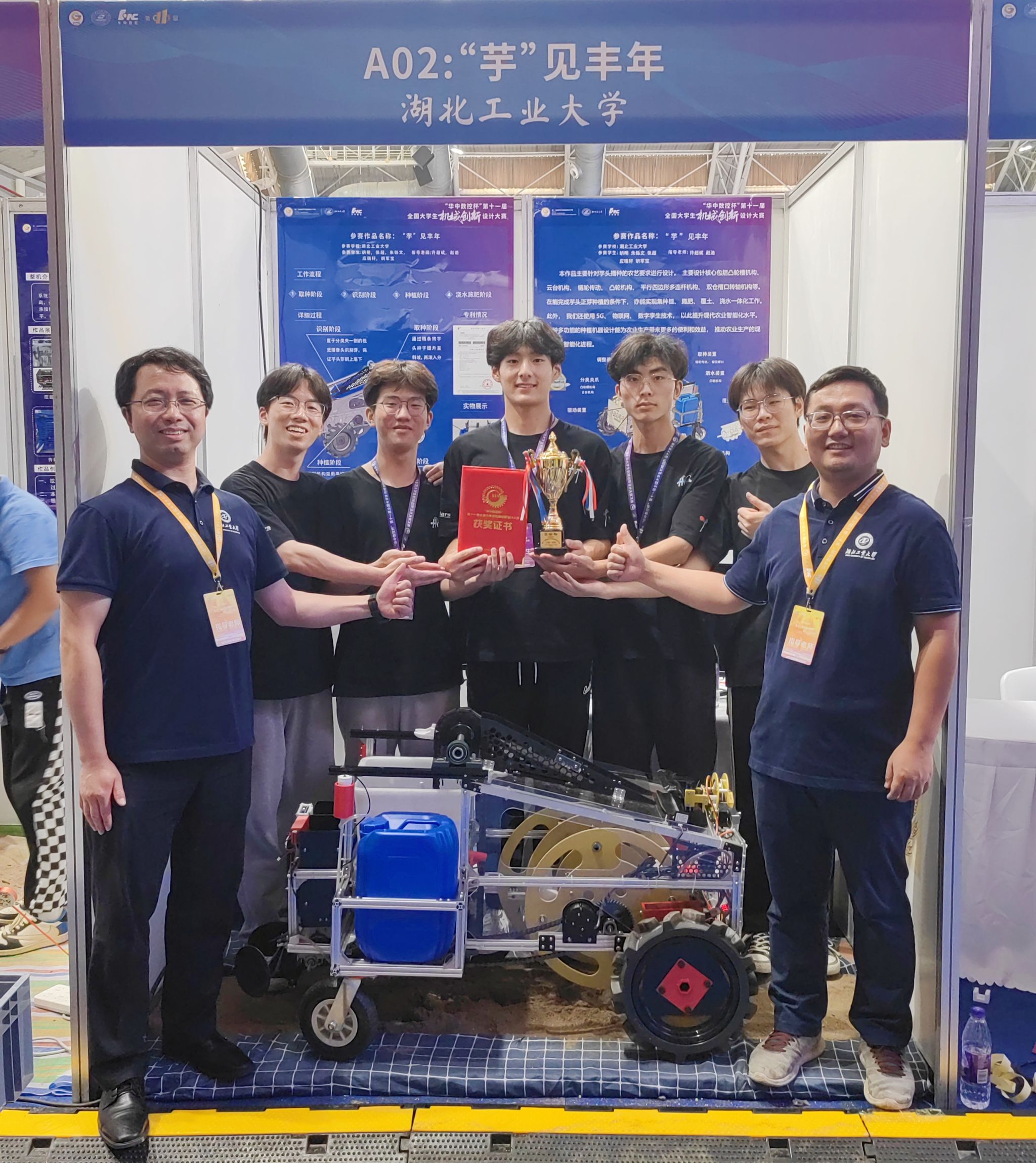 我校机械工程学院对此次大赛十分重视,自2023年10月启动校赛以来,全校共有44支队伍报名,选拔出14个队伍参加湖北省赛,最终共有3支队伍跻身全国赛,有1支队伍入围本次全国总决赛。最终,由胡明、朱铄文、应瑞轩、张超、胡军宝同学设计制作的“‘芋’见丰年——全自动芋头正芽播种机”在全国总决赛现场斩获国家一等奖;夏成辉、张哲、邱莹、张帆、胡馨予同学设计制作的“‘薏’帆丰顺——薏米自动播种施肥机”获国家二等奖。卢昶羽、王安、江文豪、水诗雨、谢作航同学设计制作的“气吸精量播种机”获国家二等奖。