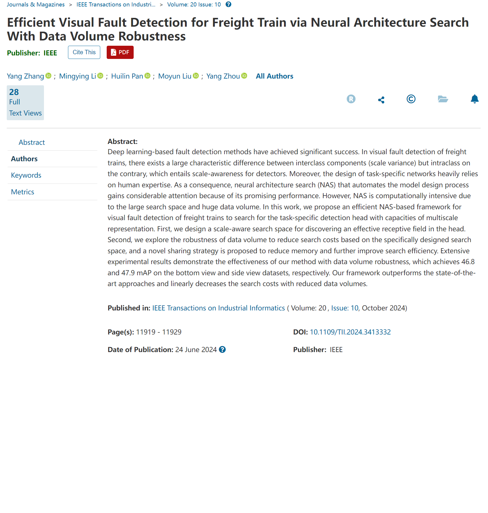 近日,工业信息学顶级期刊《IEEE Transactions on Industrial Informatics》(2024年中科院一区TOP,IF=11.7)发表了我院机器视觉与智能装备团队联合华中科技大学机械科学与工程学院刘默耘博士在深度学习工程应用领域取得的最新成果,论文题目为“Efficient Visual Fault Detection for Freight Train via Neural Architecture Search with Data Volume Robustness”。机械工程学院张杨副教授为第一作者,硕士生李明应为第二作者,湖北工业大学为第一署名单位。