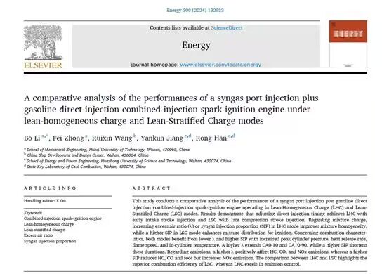 原文:Li B, Zhong F, Wang R, Jiang Y, Han R. A comparative analysis of the performances of a syngas port injection plus gasoline direct injection combined-injection spark-ignition engine under lean-homogeneous charge and Lean-Stratified Charge modes. Energy. 2024;308:132883.