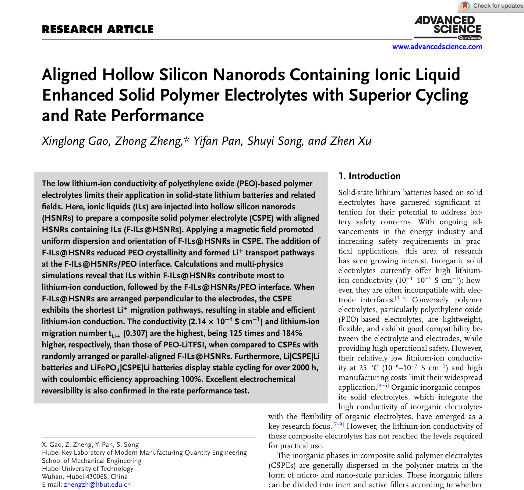 近日,国际材料领域顶级期刊《Advanced Science》(2024年中科院一区,影响因子IF=14.3)发表了我院智能制造与精密制造团队在固态电池领域取得的最新成果,论文题目为“ Aligned Hollow Silicon Nanorods Containing Ionic Liquid Enhanced Solid Polymer Electrolytes with Superior Cycling and Rate Performance” 。该论文第一单位为湖北工业大学机械工程学院,通讯作者为郑重教授,第一作者为硕士生高兴龙。