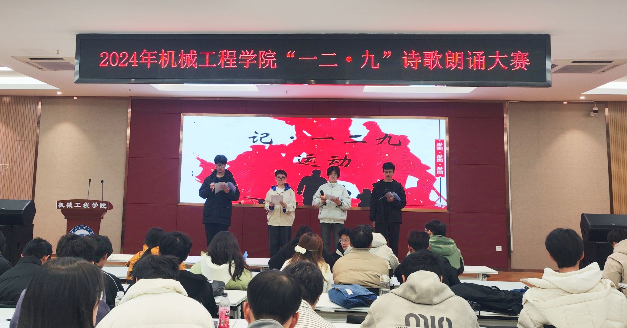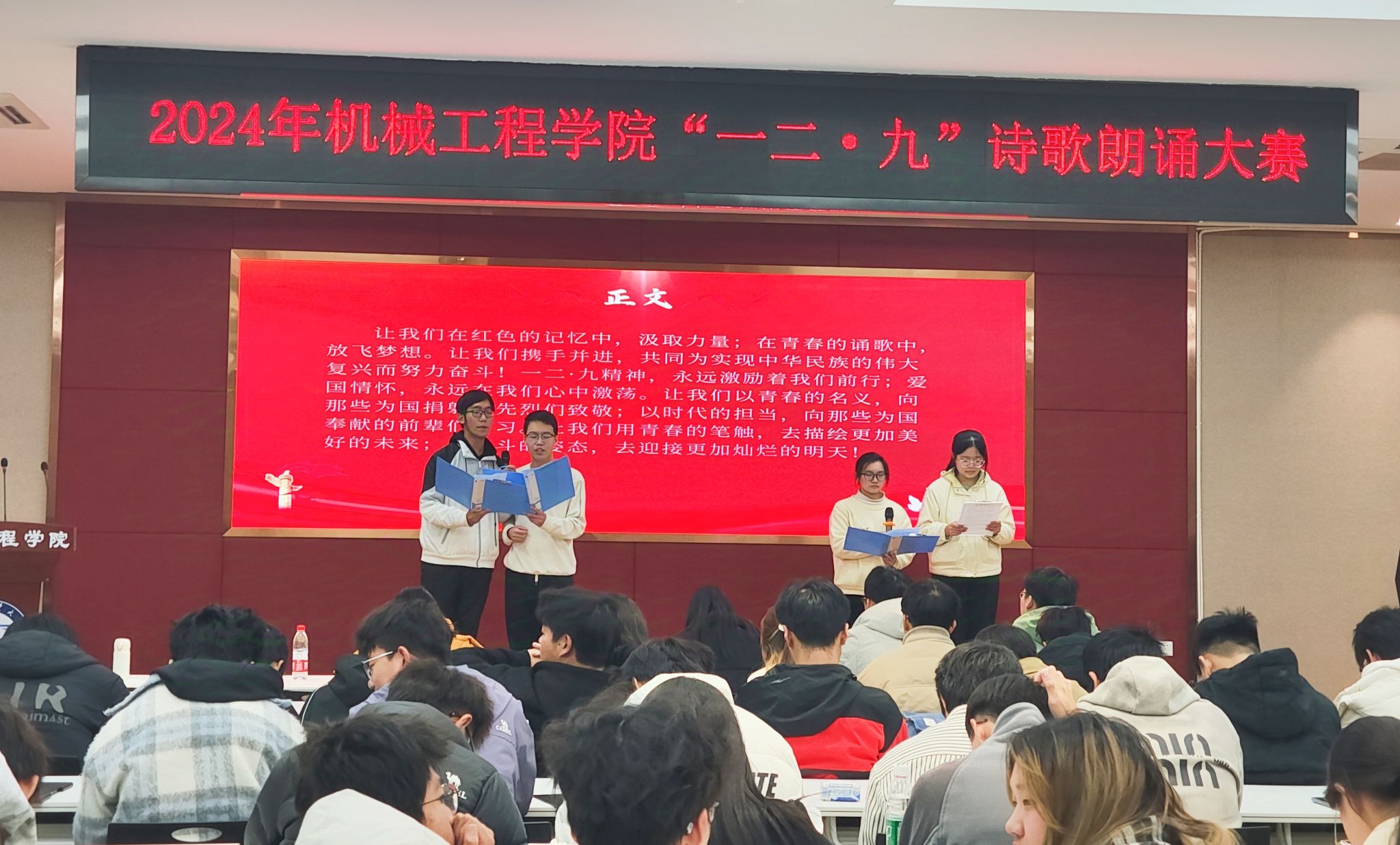 12月9日晚,为纪念“一二·九”爱国学生运动89周年,弘扬伟大的爱国主义精神,机械工程学院在机械楼报告厅成功举办了以“红色记忆·青春诵歌”为主题的诗歌朗诵比赛。辅导员李琪、薛建业等出席了此次活动。