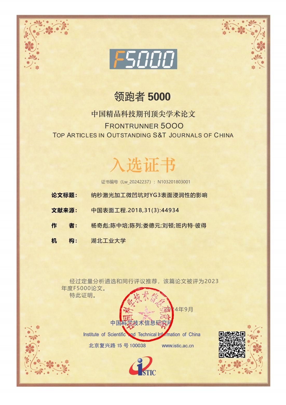 近日,国家科技部中国科学技术信息研究所(中信所)公布 “2023 年度领跑者 5000-中国精品科技期刊顶尖学术论文(F5000)”入选名单,机械工程学院激光绿色制造技术团队杨奇彪2018年发表在《中国表面工程》(第31卷第3期)题为“纳秒激光加工微凹坑对YG3表面浸润性的影响”的文章成功入选。