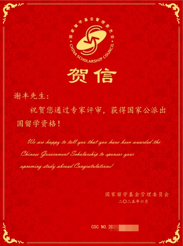 近日,国家留学基金管理委员会(CSC)公布2025年公派留学人员录取结果,我院2025届毕业研究生谢丰同学通过多轮严格评审,成功获得国家公派留学资格,将于今年9月赴英国利物浦大学工程学院攻读博士学位,获得为期48个月的资助。
