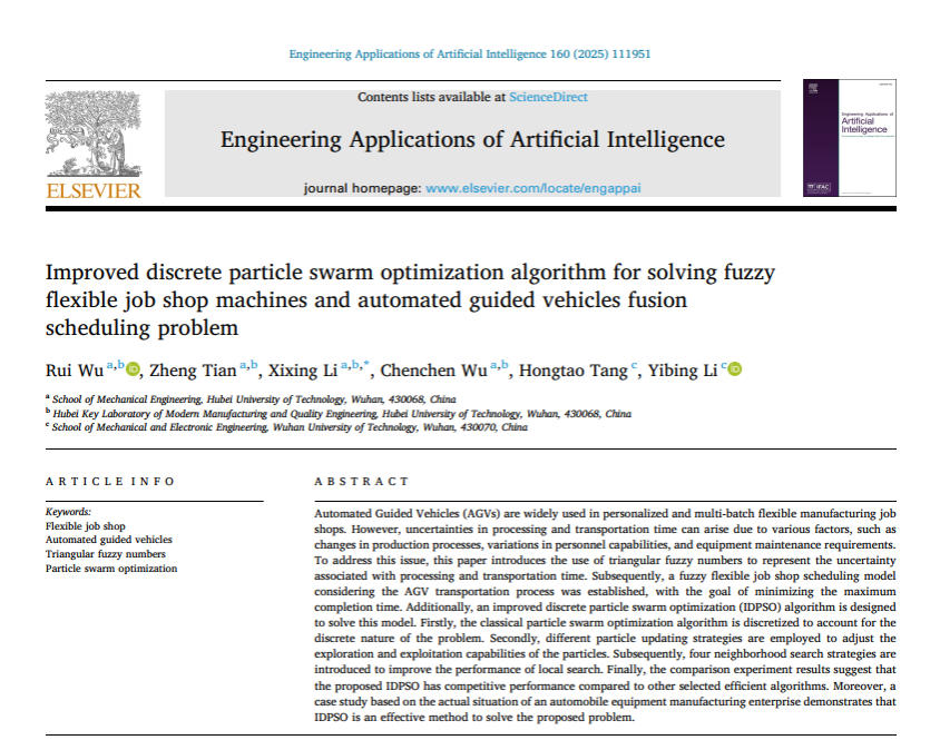 原文:Rui Wu, Zheng Tian, Xixing Li, Chenchen Wu, Hongtao Tang, Yibing Li, Improved discrete particle swarm optimization algorithm for solving fuzzy flexible job shop machines and automated guided vehicles fusion scheduling problem, Engineering Applications of Artificial Intelligence, Volume 160, Part B, 2025,111951.