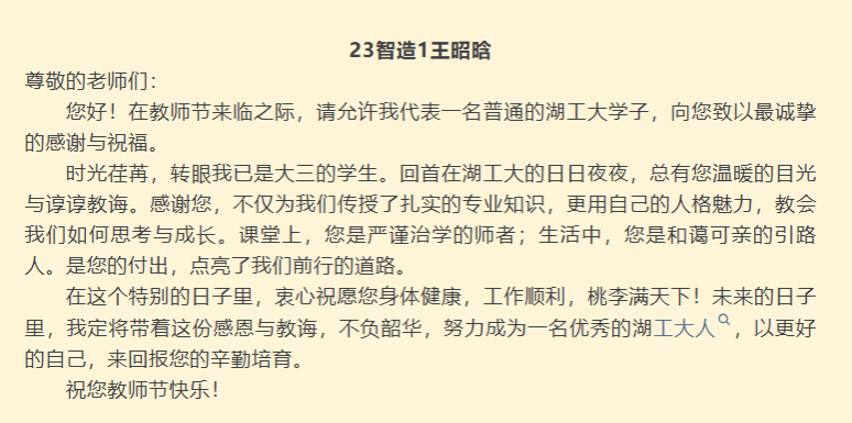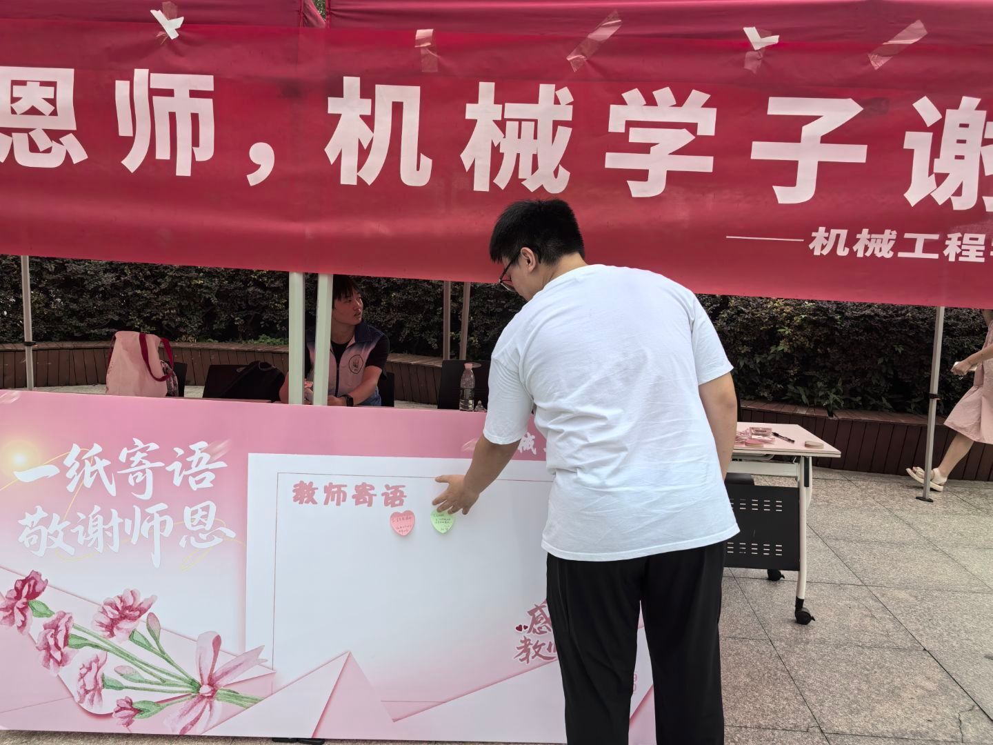 东区食堂前的广场上,同学们精心设计制作了教师节“一纸寄语·敬颂师恩”主题展板,鼓励机械学子将教师寄语写在便利贴上,用简单质朴的话语表达对老师们的深深敬意,填满了一面满载心意的“感恩墙”。此外,许多学子还以电子书信的方式,向恩师送上节日祝福,并表达了对学校全体教师的诚挚祝福与感激之情。