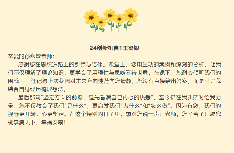 机械学子采用线上线下相结合的方式,分为“鲜花赠师”、“寄语送师”、“书信颂师”三个环节,开展教师节感恩活动。学院学生代表组成问候小队,穿梭于课堂、办公室与实验室之间,让节日祝福精准抵达。面对正在授课、备课或钻研实验的老师,为他们献上鲜花、轻声道贺,这份突如其来的温暖,点亮了老师们的工作日常。