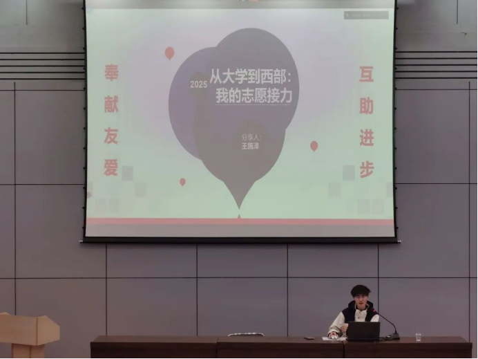 优秀学生代表王施泽分享其西部支教经历。他从湖北工业大学毕业后,远赴新疆兵团第五师职校支教。面对少数民族学生基础薄弱、环境严寒等挑战,他创新教授专业课程,并组织非遗体验、志愿服务等活动,践行“热爱祖国、无私奉献”的兵团精神。这段经历深化了他对基层教育的理解,彰显了青年担当。