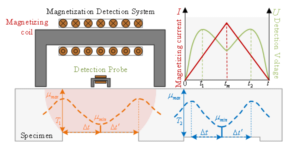 针对这一挑战,研究团队独辟蹊径,提出了“斜坡激励磁化” 检测方法。该技术的核心在于,向电磁铁施加一个低频、强度呈斜坡式变化(先线性上升后下降)的磁化电流。在此“准稳态”磁场激励下,被测铁磁构件的磁导率会随磁场强度发生非线性动态变化,其变化曲线在一个周期内会呈现出独特的 “双峰一谷” 特征。