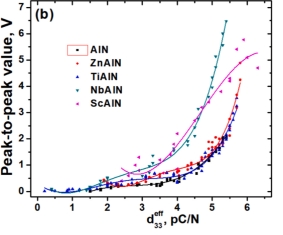 该研究表明,低浓度的Sc、Zn、Ti、Nb金属掺杂有益于增强AlN压电性能,表现出(002)择优生长取向,表面晶粒、断面柱状晶形态优良,而其压电性能、声信号与掺杂原子浓度密切相关。掺杂原子浓度增加到~5at.%时,薄膜的d33常数减小到零,这与薄膜结构质量的下降和薄膜中择优取向的丧失有关。在Zn浓度介于0.2-1.62、Sc浓度介于0.8-3.6at.%范围内时,Zn、Sc金属掺杂AlN薄膜表现出结构、性能稳定性。